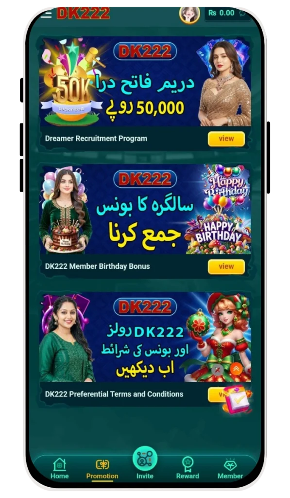 Players earn through smart moves on the DK222 real money game. You win rounds and build balance fast. Moreover, tasks add extra PKR daily. Thus, the DK222 casino games create steady income.